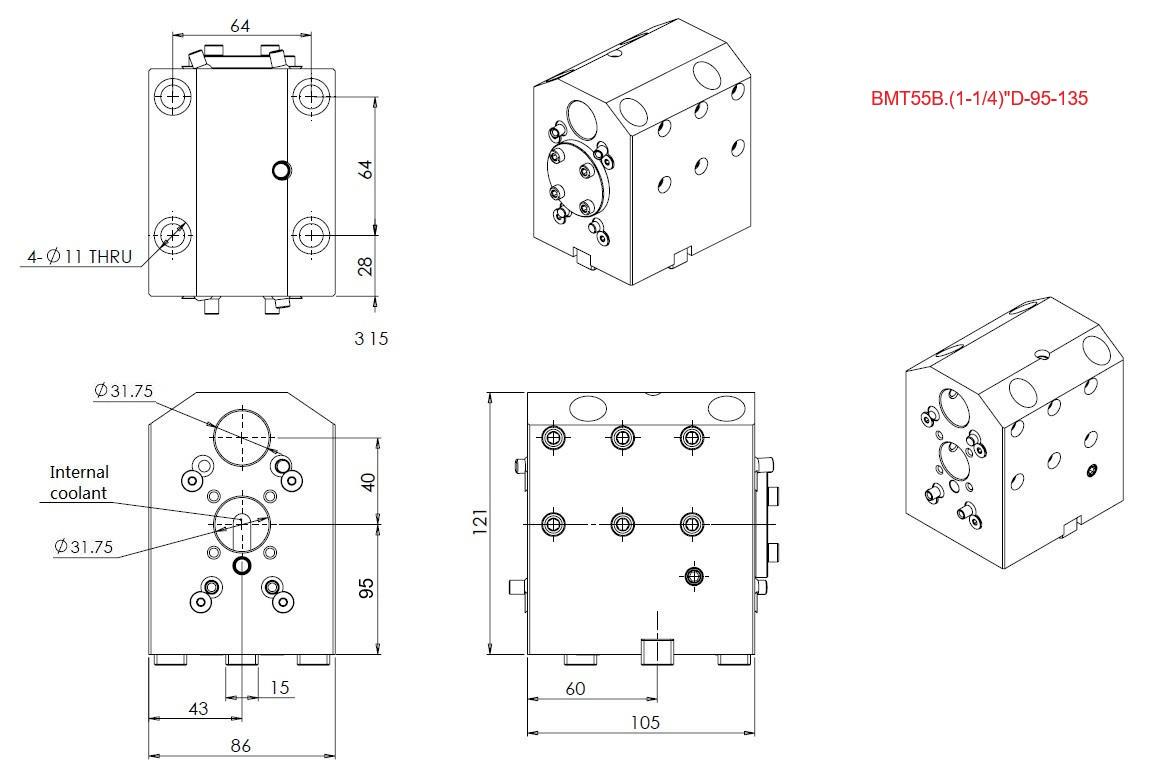 Details: BMT55 ID DOUBLE (1-1/4)" inch BORING BAR HOLDER, HEIGHT 95/135mm